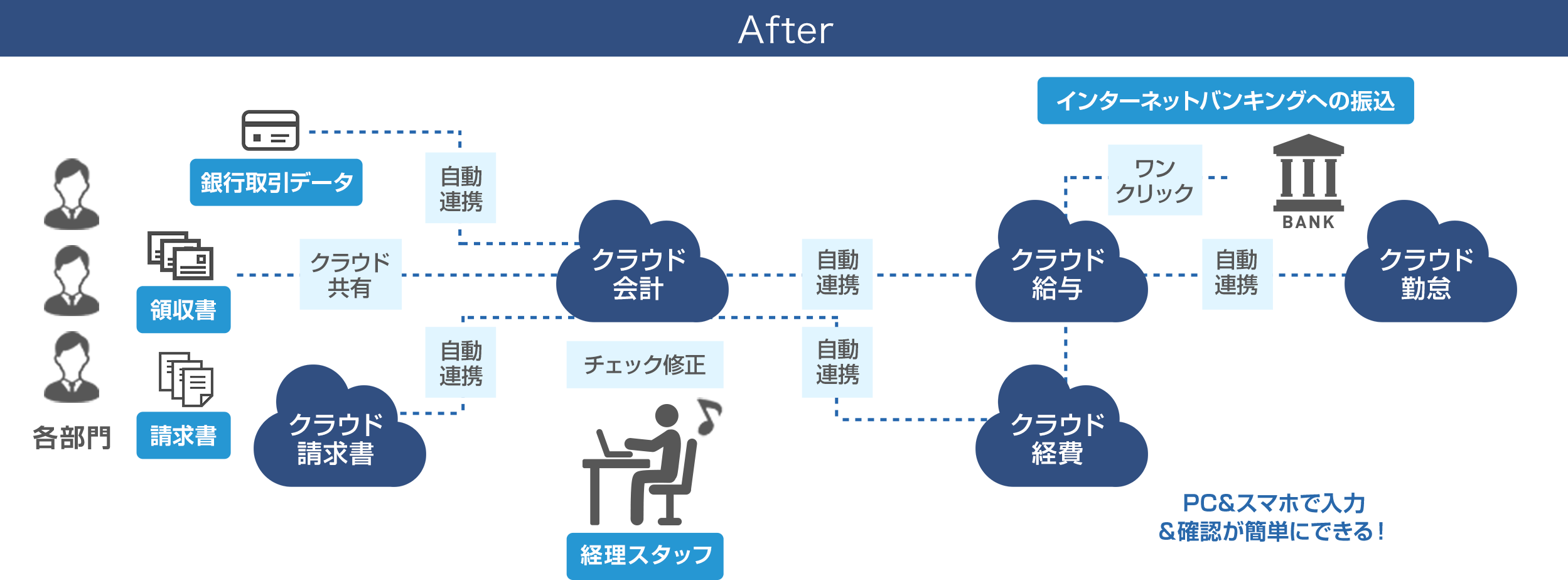各種クラウドサービスを活用することで、これまで経理スタッフが多くの工数時間をかけて入力していた各種経営数値をスピーディに把握できるようになります。